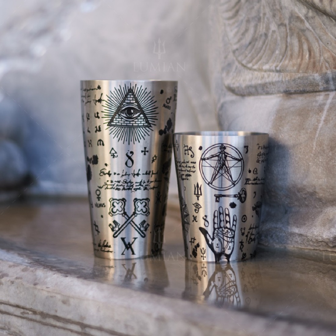 The New Boston shaker Yokai Alchemy is the perfect combination of Art and Style. The Alchemy line, designed and manufactured exclusively by Lumian Bar Tools, represents the new frontier of Barman equipment. Entirely handcrafted, the engravings of esoteric symbols intertwine with the alchemical science of modern mixology. The drawings engraved on steel intertwine with the alchemical science of modern mixology. Made of 18/10 stainless steel- matt finish. The products of the yokai line can be washed in the dishwasher. The set consists of 2 parts (Tin 28 oz and half tin18 oz). The steel used (18/10) has a thickness of 07/10 (0.7mm), which makes the shaker practical and extremely maneuverable. Suitable for hotels, Speakeasy and Cocktail Bars.