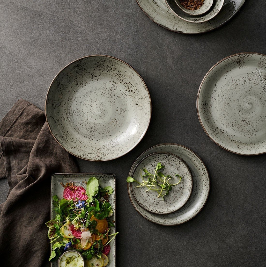 Urban appeals to a sharper, city aesthetic where food is still tied to the traditional values of honesty, integrity and authenticity, but requires a slightly more formal, more defined and refined presentation style. Emulating a concrete look, Smoke is a new collection of tableware that takes its inspiration from the aesthetics associated with the act of cooking. The subtle and nuanced tones of grey contrast with the darker reactive elements to mirror the effects of browning and searing, creating a connection between the food and the plate.